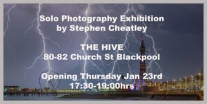 Delighted to announce my photography exhibition which will be taking place at the Hive coffee shop in Blackpool town centre. It opens on Thursday 23rd of January at 17:30-19:00hrs and will run for six weeks. I will displaying all of my favourite work from the past few years, most notably the award winning Electric Blackpool lightning image, along with a selection of my astronomy images, including Moonset Blackpool. I will also be showing many other images that I have taken up and down the county and abroad.