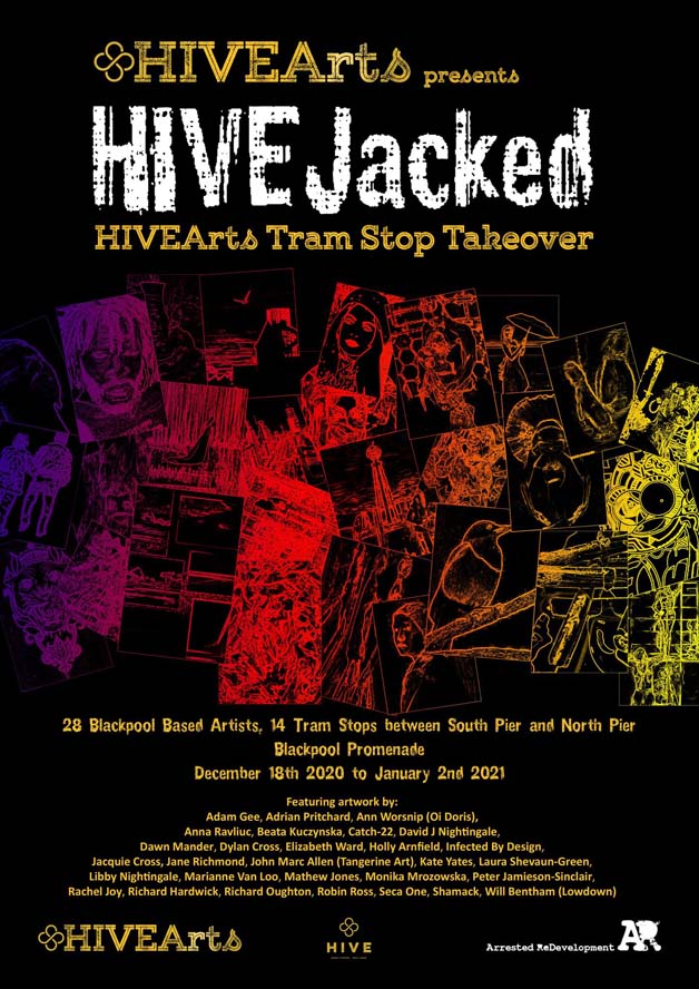 About HIVEJacked: At the start of the 2020/21 Festive Season HIVEArts staged ‘HIVEJacked, The Tram Stop Takeover’ along the famous Blackpool Promenade. This created an unprecedented outdoor art exhibition in a time where indoor exhibitions and galleries were closed to the public. This intriguing exhibition created a unique, open air, covid secure gallery that can be freely visited by the people of Blackpool. The HIVEJacked exhibition runs the full length of the promenade from North Pier through to South Pier showing large scale works of 28 members of Blackpool’s thriving arts community, many of whom are nationally and internationally recognised.